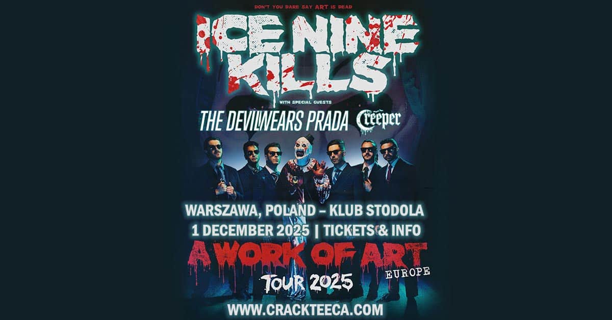 Ice Nine Kills returns to Europe with their signature mix of theatrical horror vibes and heavy riffs. On Monday, 1 December 2025, they hit Klub Stodoła (Duża Scena) — supported by The Devil Wears Prada, Creeper, and TX2 — forming a killer lineup guaranteed to deliver a night of crowd-roaring intensity for both longtime fans and newcomers.