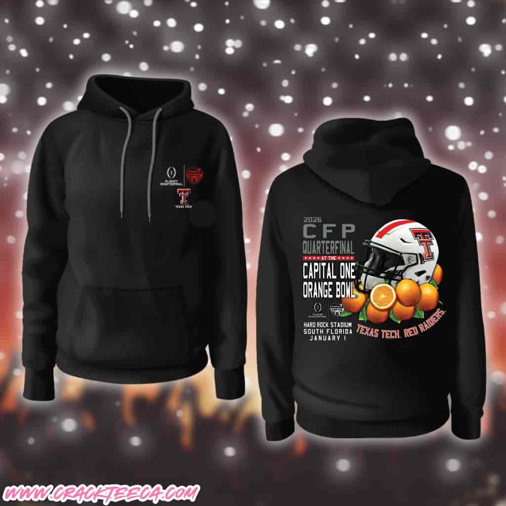 The 2026 CFP Quarterfinals Capital One Orange Bowl Texas Tech Red Raiders Bed Of Oranges Pullover Hoodie Shirt serves as a specialized piece of commemorative apparel designed for ardent supporters, alumni, and collectors tracking the Texas Tech football program’s journey through the 2025-2026 NCAA season. This garment specifically highlights the team’s achievement in reaching the Quarterfinal round of the expanded College Football Playoff, a high-stakes matchup hosted at the historic Hard Rock Stadium in Miami Gardens, Florida. The central design motif references the iconic “Bed of Oranges,” a legendary post-game tradition synonymous with this bowl game since the 1930s, where key figures of the winning team pose amidst vivid Florida citrus; this imagery on the hoodie symbolizes the pinnacle of postseason success and the unique pageantry of South Florida football. Visually, the hoodie is expected to incorporate the Red Raiders’ signature Scarlet and Black color scheme, blending the university’s distinct Double T logo with the official branding of the Capital One Orange Bowl and the College Football Playoff insignia. Crafted typically from a durable, pre-shrunk cotton and polyester fleece blend, the pullover offers functionality and warmth, making it an essential wardrobe staple for fans in Lubbock or those traveling to the milder climate of Miami for the game on New Year’s Day. The item captures the intersection of regional pride and national recognition, marking the Red Raiders’ presence on one of the sport’s biggest stages. Beyond its aesthetic appeal, the hoodie functions as a historical marker of the team’s standing within the Big 12 Conference and their pursuit of the national championship, offering a tangible connection to the excitement of the 12-team playoff era. For gift-givers, this apparel provides a meaningful option for students and family members who wish to celebrate the team’s postseason berth with a garment that balances casual comfort with specific event detailing. The integration of the year 2026 and the specific “Quarterfinals” designation ensures the item retains sentimental value long after the final whistle blows, distinguishing it from generic seasonal merchandise. By wearing this piece, fans not only display their loyalty but also participate in the shared cultural experience of the Orange Bowl, carrying a piece of the stadium’s electric atmosphere and the celebrated citrus tradition wherever they go.
