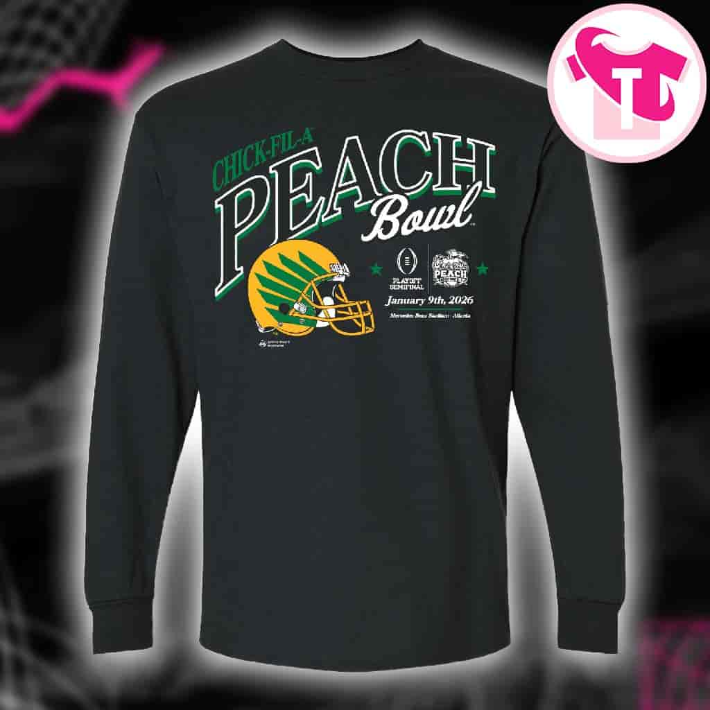 The 2026 Chick-Fil-A Peach Bowl Oregon Ducks Helmet Long Sleeve Shirt stands as a primary piece of commemorative apparel for dedicated supporters, alumni, and collectors preserving the memory of the University of Oregon’s significant appearance in the College Football Playoff Quarterfinal. Produced to mark the culmination of the 2025-2026 NCAA football season, this garment is specifically designed to offer both comfort and a visual statement of allegiance during the colder winter months associated with the New Year’s Six bowl cycle. The shirt’s design centers on a high-definition graphic of the Oregon Ducks football helmet, a piece of equipment renowned in the sports world for its innovative aesthetics and frequent stylistic evolutions. This central image is typically paired with the official Chick-Fil-A Peach Bowl branding and the “2026” date, anchoring the item to the specific event rather than a general season, which enhances its value as a historical keepsake for fans of the Big Ten Conference program.