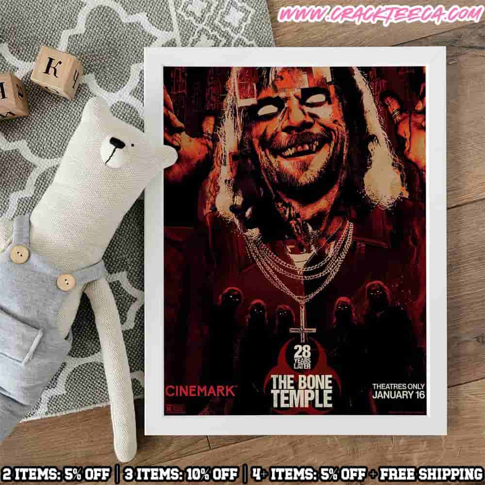 The 28 Years Later The Bone Temple Movie Poster On January 16 2026 T-Shirt serves as a definitive commemorative garment for dedicated fans of the post-apocalyptic horror genre and collectors of contemporary cinema history. This high-quality piece of fan apparel celebrates the wide North American theatrical debut of 28 Years Later: The Bone Temple, which arrives in theaters on January 16, 2026, distributed by Sony Pictures Releasing and Columbia Pictures. As the fourth installment in the influential series, this sequel expands the harrowing world established by Danny Boyle and Alex Garland, transitioning the narrative into a new era directed by Nia DaCosta. The design of the shirt prominently features the official theatrical movie poster, highlighting a stark and atmospheric visual aesthetic that reflects the film’s shift toward “auteur horror.” The artwork typically utilizes a dark palette of distressed greys, deep blacks, and blood-red accents, capturing the unsettling premise where the inhumanity of survivors rivals the threat of the infected. Set in a ravaged Britain decades after the initial Rage Virus outbreak, the design incorporates the haunting imagery of the “bone temple” shrine, a central location in the film’s plot involving Dr. Ian Kelson, portrayed by Ralph Fiennes, and the menacing Jimmy Crystal, played by Jack O’Connell. This unisex t-shirt is crafted from premium, breathable materials—often 100% pre-shrunk cotton or high-performance jersey blends—ensuring a comfortable fit and long-term durability for supporters attending opening-night screenings at major cinema circuits. As an officially licensed studio product, every detail from the typography to the placement of the title treatment adheres to the strict intellectual property standards of the production houses. The shirt carries significant sentimental and chronological value, serving as a functional record of the 2026 winter film season and a unique gift for those who follow the creative evolution of screenwriter Alex Garland’s apocalyptic vision. Whether worn as a daily casual piece or preserved as a historical artifact within a curated horror memorabilia collection, this apparel provides a tangible connection to a landmark moment in the “28 Days Later” legacy. By integrating key entities such as 28 Years Later movie merchandise, The Bone Temple release date gear, and official horror film t-shirts, this description offers an accurate resource for fans seeking authentic 2026 cinematic memorabilia.