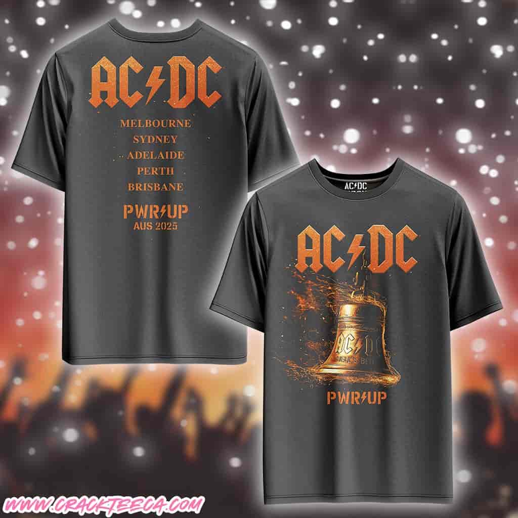 Celebrate the homecoming of rock legends with this officially licensed AC/DC “PWR Up” Tour T-Shirt, specifically designed to commemorate the highly anticipated Australian leg in 2025. This exclusive piece of merchandise is a must-have for Australian fans, serving as a powerful and authentic souvenir of the band’s massive global return, supporting their chart-topping 2020 album, Power Up. The T-shirt design pays homage to one of AC/DC’s most enduring and powerful anthems, “Hells Bells,” incorporating a striking visual motif: a bold, crackling lightning bolt often associated with the band’s logo and the electrifying energy of their live performances. This unique design element captures the raw intensity of the show, perfectly embodying the spirit of the iconic song and the visual spectacle of the tour. The limited-edition nature of the Australia 2025 designation makes this shirt a highly sought-after collector’s item, distinct from the main global tour merchandise. The Australian concerts are particularly significant as they represent a return to the band’s roots, with founding members Angus Young and Brian Johnson bringing their world-class show back to their spiritual homeland.