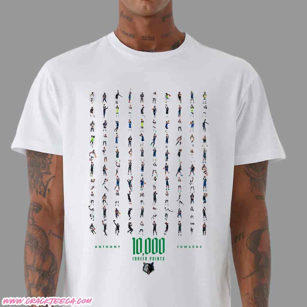 The Anthony Edwards Ant-Man Legend 10000 Points In The Minnesota Timberwolves Uniform T-Shirt is a premier piece of commemorative sports apparel designed to celebrate a historic milestone in professional basketball. This shirt serves as a significant keepsake for Minnesota Timberwolves fans, NBA collectors, and those seeking a high-value gift that captures the ascent of one of the league’s most dynamic scoring threats. The product specifically honors the moment Anthony Edwards reached the 10,000 career points threshold while wearing the iconic Timberwolves jersey, solidifying his status as a franchise cornerstone at Target Center in Minneapolis. As a “Legend” edition, the garment focuses on the “Ant-Man” persona, a nickname that has become synonymous with Edwards’ explosive playstyle and charismatic leadership on the court. The design typically features a bold central graphic that integrates the number 10,000 with the Timberwolves’ official navy, white, and aurora green color palette, often accompanied by action silhouettes or stylized typography that reflects the energy of a sold-out crowd in the Twin Cities.