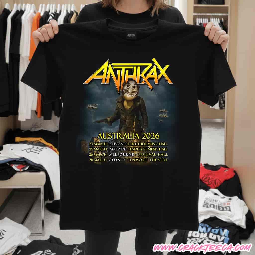However, the true value of this collector’s item lies on the back, where the specific March 2026 tour itinerary is proudly displayed, immortalizing the four massive nights of mayhem organized by Live Nation. The design details the band’s destructive path across the continent, listing the exact dates and iconic venues where Scott Ian’s right hand will deliver unparalleled riffage: kicking off on March 23 at The Fortitude Music Hall in Brisbane, storming through Adelaide’s Hindley Street Music Hall on March 25, shaking the foundations of the historic Festival Hall in Melbourne on March 26, and culminating in a final explosive performance at the Enmore Theatre in Sydney on March 28. Wearing this shirt is not just about fashion; it is a declaration of loyalty to a band that has defined the genre for over four decades alongside Metallica, Slayer, and Megadeth. It serves as a physical ticket stub for a career-spanning setlist that promises to deliver pit anthems like “Caught in a Mosh,” “Indians,” and “Madhouse,” alongside deep cuts and potential new material from their eagerly anticipated twelfth studio album. Whether you are a veteran thrasher who has followed Joey Belladonna and Frank Bello since the Among the Living days, or a new fan witnessing the power of Charlie Benante’s drumming for the first time, this tour date t-shirt is the ultimate souvenir to prove you were there when the kings of thrash reclaimed Australian soil. Secure this piece of merchandise to keep the spirit of the 2026 tour alive long after the amplifiers have been turned off and the house lights have gone up.