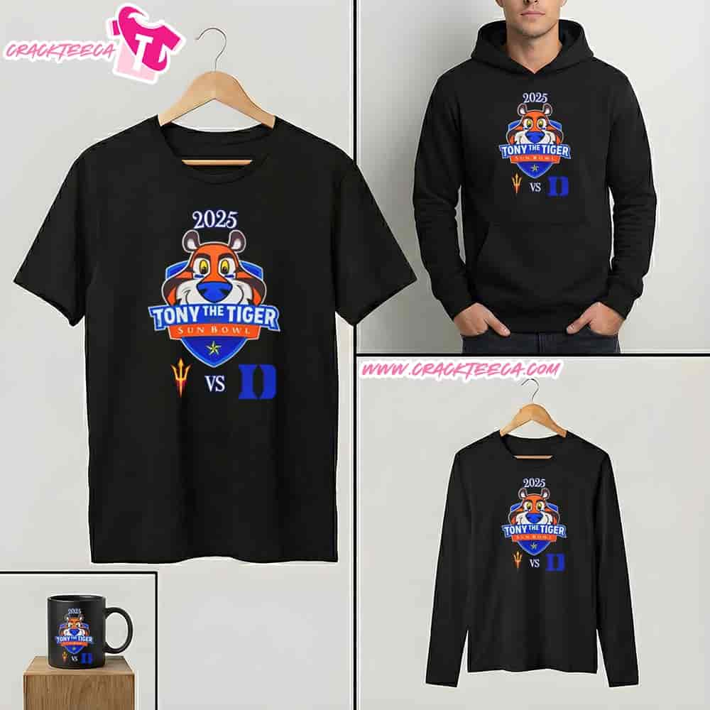 The Arizona State Sun Devils Vs Duke Blue Devils On December 31 Tony The Tiger Sun Bowl 2025 T-Shirt serves as a definitive piece of commemorative apparel for the 2025-2026 college football postseason, specifically tailored for devoted alumni, students, and collectors. This officially licensed garment celebrates a unique “Battle of the Devils” at the historic Sun Bowl Stadium in El Paso, Texas, marking a compelling intersection between the Big 12 Conference and the Atlantic Coast Conference. The shirt functions as a visual scorecard for the event, typically featuring a “dueling” graphic layout that juxtaposes the Arizona State Sun Devils’ iconic pitchfork or Sparky mascot in maroon and gold against the Duke Blue Devils’ classic “Block D” or Blue Devil silhouette in Duke blue and white. Central to the visual composition is the official Tony The Tiger Sun Bowl branding, which anchors the item as event-specific memorabilia rather than standard seasonal gear, often screen-printed with high-definition inks to ensure longevity and color vibrancy. The inclusion of the date, December 31, 2025, transforms the product into a timestamped keepsake, preserving the memory of this New Year’s Eve clash between two storied programs known for their distinct athletic identities and academic prestige.