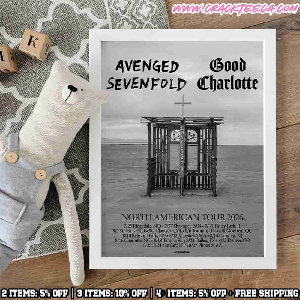 The “Avenged Sevenfold With Good Charlotte North American Tour Dates 2026 Home Decor Poster Canvas” serves as a premier piece of interior wall art designed for the dedicated followers of two distinct yet influential rock giants. Released to coincide with the highly anticipated joint trek scheduled for the summer of 2026, this canvas print targets a diverse demographic of “Deathbats Club” members and Good Charlotte loyalists who wish to immortalize the convergence of progressive metal and pop-punk in their living spaces. Unlike standard paper posters that are prone to tearing and creasing, this item is typically crafted from high-grade, artist-quality canvas material, utilizing archival inks that resist fading from UV exposure. This ensures that the vibrant, high-contrast graphics—often depicting a stylistic fusion of Avenged Sevenfold’s signature winged Deathbat or Wes Lang-inspired skeletal imagery with Good Charlotte’s classic heraldic typography—remain sharp and impactful for years. The visual composition usually features the tour’s official key art centered above a verified list of tour stops, transforming the piece from mere decoration into a historical record of the event.