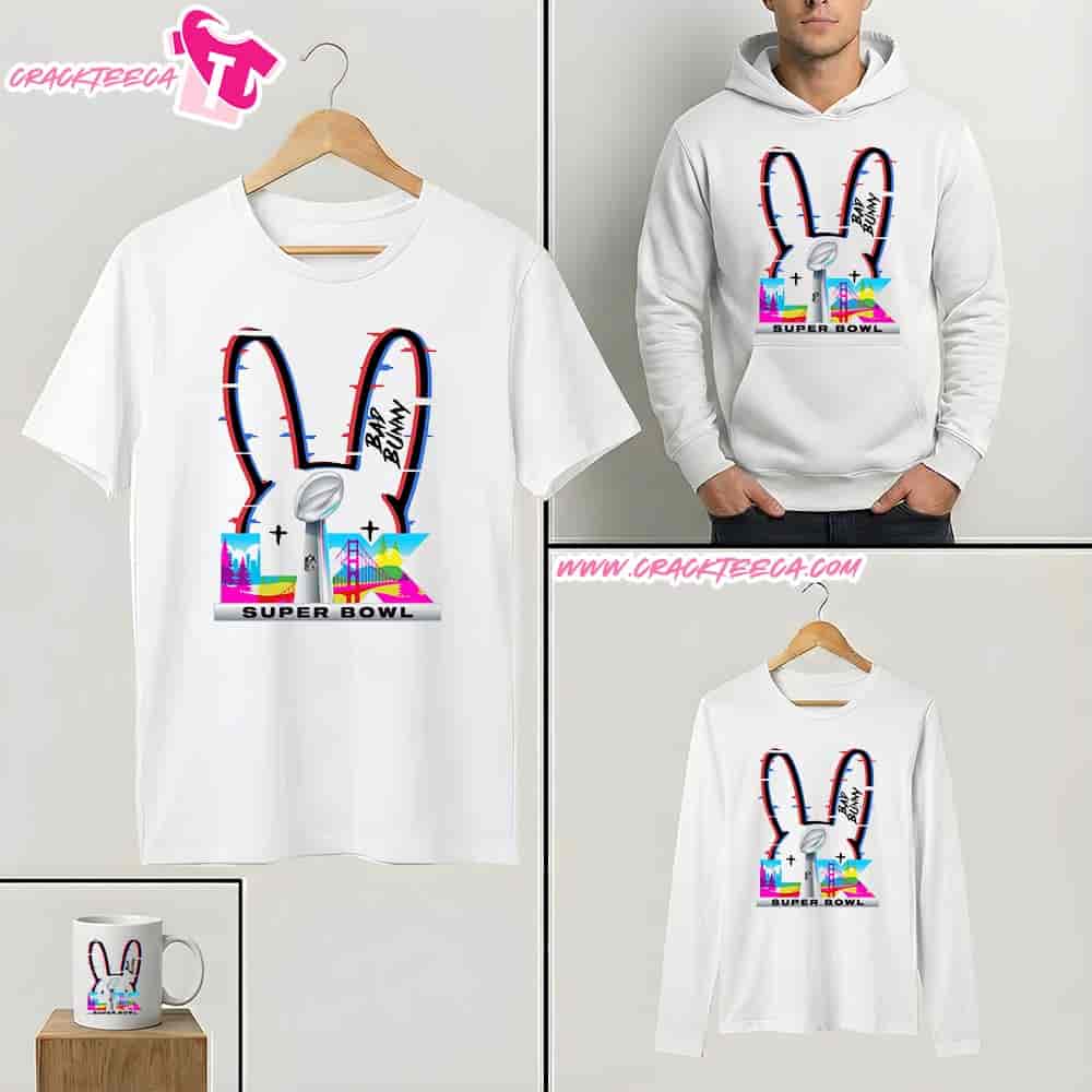 The Bad Bunny X Super Bowl LX Official Logo Rainbow Short Sleeve T-Shirt Hoodie is a contemporary graphic apparel piece positioned for fans of global Latin music, American football culture, and collectors who follow the intersection of sports branding and pop artistry in the mid-2020s. Anchored to Super Bowl LX, the 60th championship game of the National Football League scheduled for the 2025–2026 season at Levi’s Stadium in Santa Clara, California, this product ties its identity to a verified NFL milestone while drawing stylistic inspiration from Bad Bunny’s widely recognized visual language. Offered as a short sleeve T-shirt or hoodie variation depending on the selection, the item is designed for a broad, unisex audience, making it suitable for everyday wear, event viewing, or gifting to fans who appreciate culturally relevant sports apparel. The central design element combines the official Super Bowl LX logo with a rainbow-accented graphic treatment, a color approach commonly associated with Bad Bunny–inspired aesthetics that emphasize boldness, individuality, and contemporary streetwear appeal. While the title references Bad Bunny, the design should be understood as artist-inspired rather than an explicit collaboration unless confirmed by the retailer, with the rabbit or rainbow motifs functioning as symbolic nods familiar to fans of the Puerto Rico–born artist rather than direct album or tour imagery. As a single-item apparel product rather than a bundle, the focus remains on the front-facing artwork, with clean composition intended to balance NFL branding and music-influenced style without overcrowding. Specific fabric blends, weights, or sizing charts vary by manufacturer and should be verified at purchase, but the short sleeve and hoodie formats support year-round use across different climates and settings. Geographically, the reference to Santa Clara and Levi’s Stadium places the piece within the Bay Area sports landscape, a region closely tied to NFL history and Super Bowl hosting legacy. From a functional perspective, the shirt or hoodie is appropriate for Super Bowl watch parties, casual outings, concerts, and informal social events, while also holding value as a commemorative item linked to a named Super Bowl edition. It works as a gift for fans of Bad Bunny, NFL followers, or collectors who track Super Bowl–specific merchandise tied to a particular year and venue. Licensing status should be confirmed with the seller, as the presence of the Super Bowl LX logo typically indicates officially licensed NFL Super Bowl apparel, while artist references may vary by authorization. Naturally integrated search relevance includes terms such as Bad Bunny Super Bowl shirt, Super Bowl LX apparel, NFL Super Bowl hoodie, Levi’s Stadium Santa Clara, and Latin music inspired streetwear, all grounded in verifiable event context and established public identities.
