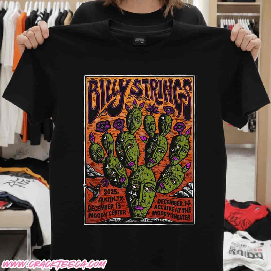 The Billy Strings Austin Texas 2025 Poster T-Shirt is a comprehensive piece of concert memorabilia that encapsulates the bluegrass virtuoso’s unique two-night engagement in the heart of the Texas capital. Designed for the dedicated “Goats” fanbase and collectors of music history, this apparel immortalizes the specific run scheduled for December 13 at the expansive Moody Center and December 14 at the legendary ACL Live at The Moody Theater. This dual-venue listing highlights a rare touring configuration where the artist transitions from a high-capacity arena spectacle to a more intimate performance within the celebrated home of the Austin City Limits television series. The garment’s design centrally features the official poster artwork commissioned for this Austin stop, typically created by prominent visual artists in the psychedelic-Americana sphere who incorporate localized Texan imagery such as desert motifs or cosmic western themes. By transferring the intricate linework and vibrant color palette of the limited-edition paper lithograph onto high-quality fabric, this item allows fans to wear the visual identity of the show.