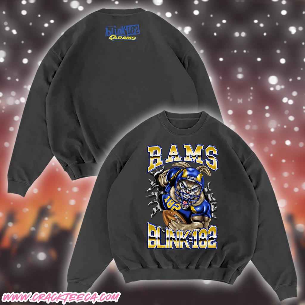 Constructed typically from a heavyweight, ring-spun cotton and polyester fleece blend, the sweatshirt offers substantial warmth and durability, making it an essential layer for late-season night games at the open-air SoFi Stadium in Inglewood or for attending outdoor concerts in the cooler coastal evenings. The garment usually features a classic crewneck or hooded silhouette with ribbed knitting at the cuffs and hem to ensure a secure fit that withstands the rigors of active wear and cheering. The fabric is chosen to support high-quality screen printing, ensuring that the intricate lines of the rabbit design remain sharp and resistant to cracking after repeated washes. Beyond its utility, this item contextualizes the band’s enduring dominance in the San Diego and Los Angeles music scene, linking their sonic history with the modern era of Los Angeles football. As a gift, it appeals significantly to collectors who prioritize rare crossover collaborations, offering a tangible connection to two pillars of West Coast entertainment. Whether worn to tailgate parties, casual social gatherings, or music festivals, this *Blink-182 Los Angeles Rams apparel* validates the owner’s eclectic taste, standing as a sophisticated piece of pop-culture memorabilia that transcends the standard boundaries of band tees and athletic jerseys, celebrating a specific moment in 2025 where the energy of the mosh pit meets the intensity of the gridiron.