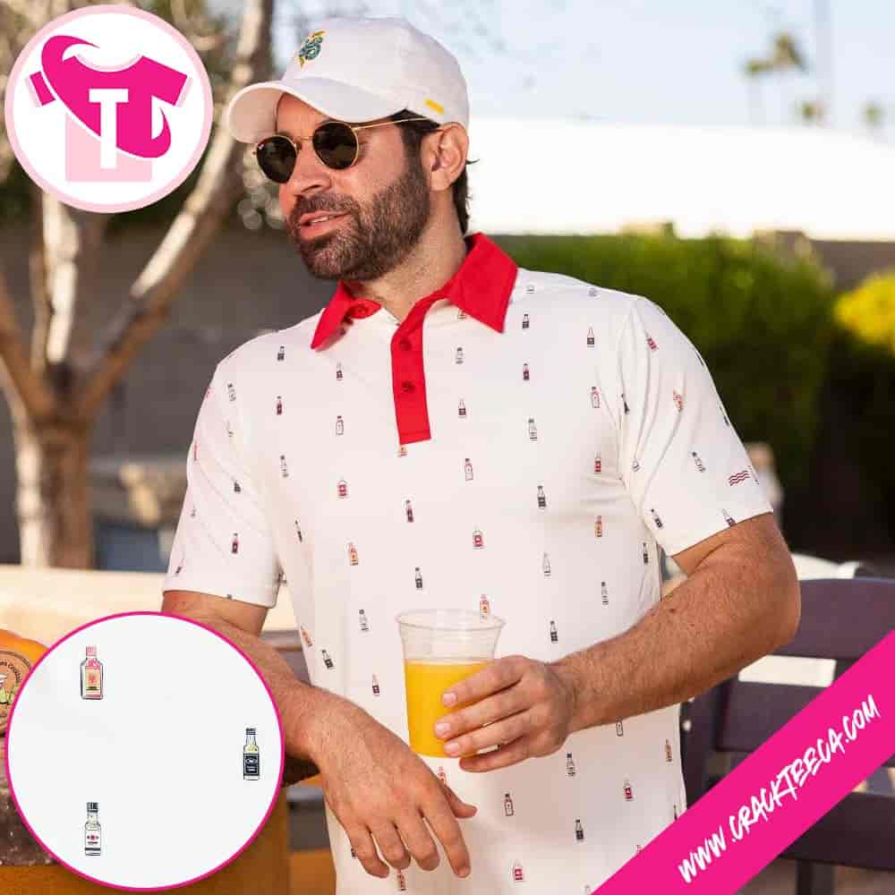 The “Breakfast Balls Shooters Shoot All Day Golf Polo Shirt” stands as a bold expression of the evolving culture within recreational golf, explicitly targeting the demographic that views the sport as a social catalyst rather than just a competitive endeavor. Manufactured under the Breakfast Balls label, a dedicated golf sub-brand of RSVLTS, this garment is designed for the player who embraces the “19th hole” atmosphere from the very first tee. The shirt’s design concept is a literal and playful interpretation of its title, featuring a dynamic, all-over print of miniature liquor bottles—commonly referred to as “shooters” or “nips”—scattered across the fabric. This visual motif celebrates the time-honored tradition of “birdie juice” and course-side toasts, making it a distinct choice for bachelor parties, charity scrambles, or casual weekend rounds at municipal courses where the vibe is relaxed and celebratory. The graphic layout balances the vibrant colors of the various spirit labels against a neutral background, ensuring the pattern pops without being overwhelming, perfectly capturing the fun-first mentality of the modern “bogey golfer.”