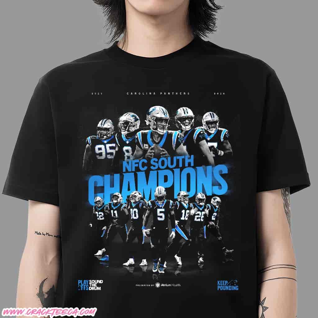 The Carolina Panthers 2025 NFC South Champions Keep Pounding Official Fan Gear Unisex T-Shirt serves as a definitive piece of commemorative apparel for the “Panthers Nation,” marking the franchise’s return to the top of the division standings during the 2025 NFL season. This garment is designed to honor the team’s resilience and success in outpacing regional rivals like the Atlanta Falcons, New Orleans Saints, and Tampa Bay Buccaneers to secure the division crown. Central to the design is the iconic “Keep Pounding” mantra, a phrase deeply embedded in the team’s DNA that originated from the late Sam Mills; its prominence on the shirt connects the current 2025 roster’s achievement with the organization’s historical legacy of perseverance. The t-shirt typically features bold screen-printed graphics that combine this slogan with the aggressive Panthers logo, utilizing the official team colors of Process Blue, Black, and Silver to ensure immediate brand recognition and a cohesive look for fans.
