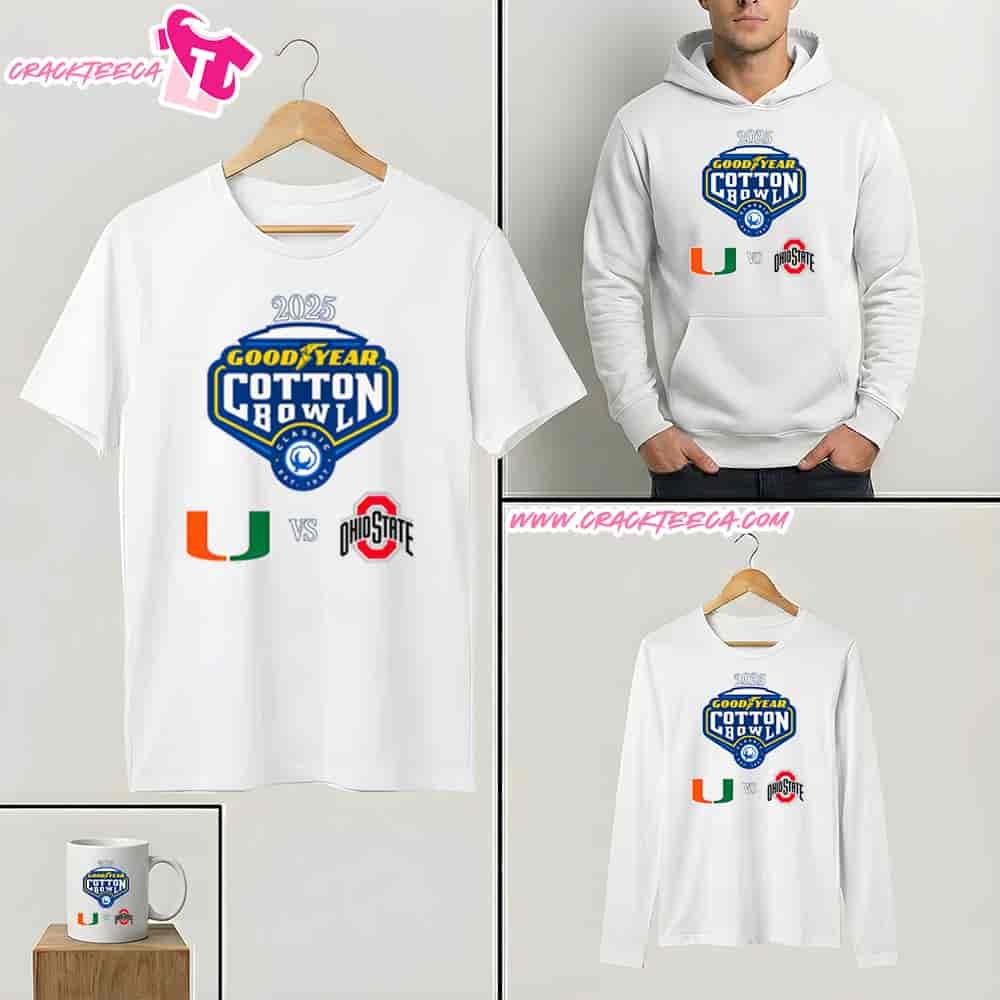 About CFP Quarterfinal 2025 Goodyear Cotton Bowl Classic Miami Hurricanes Vs Ohio State Buckeyes Match Up Shirt By Crackteeca