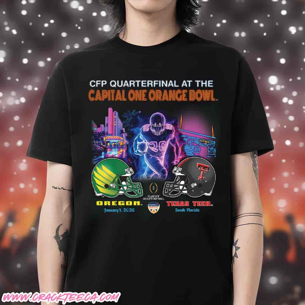 About CFP Quaterfinals 2026 Capital One Orange Bowl Oregon Ducks Vs Texas Tech On January 1 Art Decor Game T-Shirt By Crackteeca
