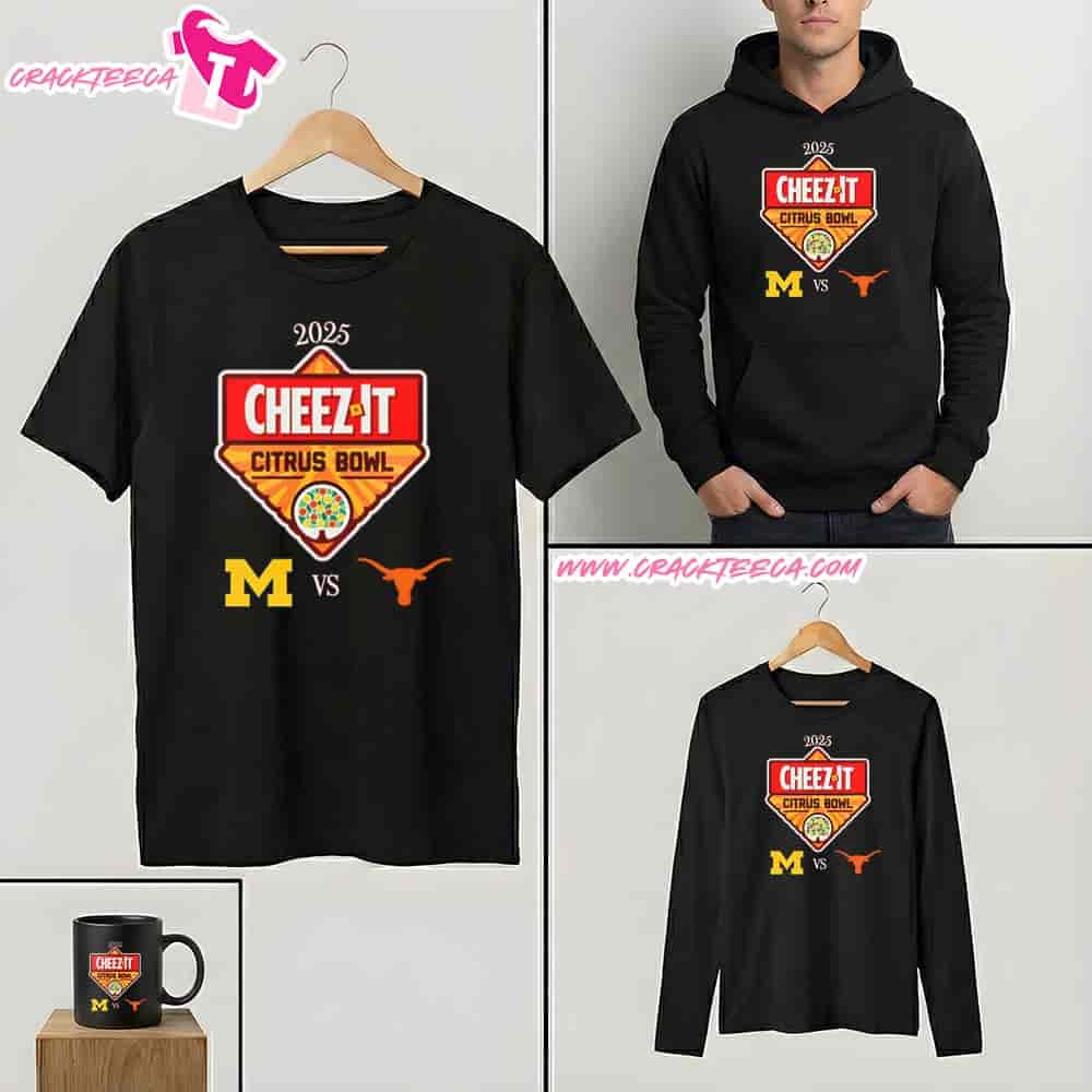 The Cheez-IT Citrus Bowl 2025 Michigan Wolverines Vs Texas Longhorns On December 31 T-Shirt stands as a premier piece of commemorative apparel designed for the legion of devoted fans, alumni, and collectors gathering in Central Florida for this marquee postseason event. This officially licensed garment serves as a tangible record of the high-profile clash between two of college football’s most storied “blue blood” programs: the Michigan Wolverines from the Big Ten Conference and the Texas Longhorns, representing the Southeastern Conference. The shirt’s design is meticulously crafted to celebrate this specific matchup, typically featuring a “dueling” graphic layout that positions the iconic Michigan Block “M” in maize and blue alongside the distinctive Texas Longhorn silhouette in burnt orange and white. Anchoring the visual profile is the official Cheez-IT Citrus Bowl branding, often incorporating the playful cheddar cracker mascot that has become synonymous with the bowl’s identity, ensuring the item is recognized as event-specific memorabilia rather than standard seasonal gear. The inclusion of the date, December 31, 2025, serves a dual purpose: it marks the specific game day and highlights the unique context of attending a major sporting event on New Year’s Eve in Orlando.