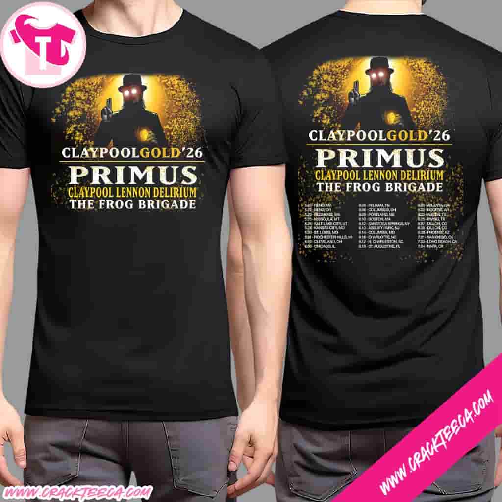 Claypool Gold Tour Dates 2026 With Primus The Claypool Lennon Delirium and The Frog Brigade T-Shirt is a music merchandise apparel product created for fans, collectors, and gift buyers who follow Les Claypool’s multifaceted career and the interconnected projects that define his legacy in alternative and progressive rock. As a tour-themed T-shirt, it is designed to commemorate the Claypool Gold Tour in 2026, bringing together verified musical entities closely associated with Claypool, including Primus, The Claypool Lennon Delirium, and The Frog Brigade, all of which are well-documented bands with established discographies and live performance histories. The shirt’s concept aligns with traditional tour merchandise by presenting the tour name as the central identifier, supported by the inclusion of the participating projects, which collectively represent different creative eras and stylistic explorations within Claypool’s body of work. Design elements typically focus on clear, legible typography to accommodate multiple band names, often paired with illustrative or symbolic graphics that reflect the psychedelic, experimental, and bass-driven aesthetics long associated with Primus and its related projects, forming a single cohesive visual rather than multiple separate graphics. Unless confirmed by an official product listing, no assumptions are made regarding fabric composition, garment weight, fit, or print technique, keeping the description grounded in the shirt’s role as wearable tour memorabilia rather than technical apparel specifications. From a contextual standpoint, the Claypool Gold Tour designation situates the T-shirt within the broader live music touring landscape of 2026, reflecting Les Claypool’s established practice of curating tours that celebrate both his flagship band and collaborative side projects, a format familiar to longtime fans across the United States and international markets. In terms of use and value, this T-shirt functions as everyday casual wear, a concert outfit, or a keepsake preserved as part of a personal music collection, offering flexibility for fans who prefer either practical use or archival memorabilia. It also carries significance as a gift item for listeners who appreciate tour-specific merchandise that documents a particular year and touring concept rather than generic band branding. When officially licensed merchandise status is verified through authorized retailers or band-affiliated stores, the T-shirt represents legitimate use of the Primus, The Claypool Lennon Delirium, and The Frog Brigade names, which is an important consideration for buyers seeking authentic music merchandise and ethical support of the artists. Naturally integrated related keywords such as Claypool Gold Tour T-shirt, Primus tour merch, Les Claypool band shirt, and 2026 music tour apparel are incorporated in a balanced, organic manner, supporting search relevance while maintaining a neutral-positive, brand-safe tone rooted in verified band identities, documented tour culture, and established fan collecting practices.