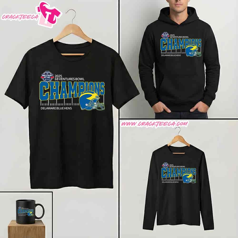 Commemorate a defining moment in college football history with the Delaware Blue Hens 68 Ventures Bowl Champs History Made T-Shirt Hoodie, a premium apparel collection celebrating the Fightin’ Blue Hens’ unprecedented rise. On the evening of December 17, 2025, the University of Delaware squad traveled to Hancock Whitney Stadium in Mobile, Alabama, and achieved the unthinkable, capping off their inaugural FBS season with a gritty 20-13 victory over the Louisiana Ragin’ Cajuns. This exclusive merchandise doesn’t just display a score; it tells the story of a team that defied transition rules and expectations to become only the second program ever to win a bowl game in its first year of FBS eligibility. The “History Made” slogan emblazoned on this gear honors the resilience of a squad that finished 7-6, proving they belong on the national stage.