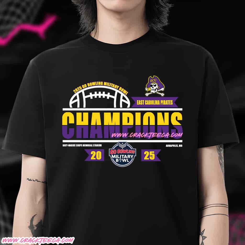 About East Carolina Pirates 2025 Go Bowling Military Bowl Champions Locker Room Unisex T-Shirt By Crackteeca
