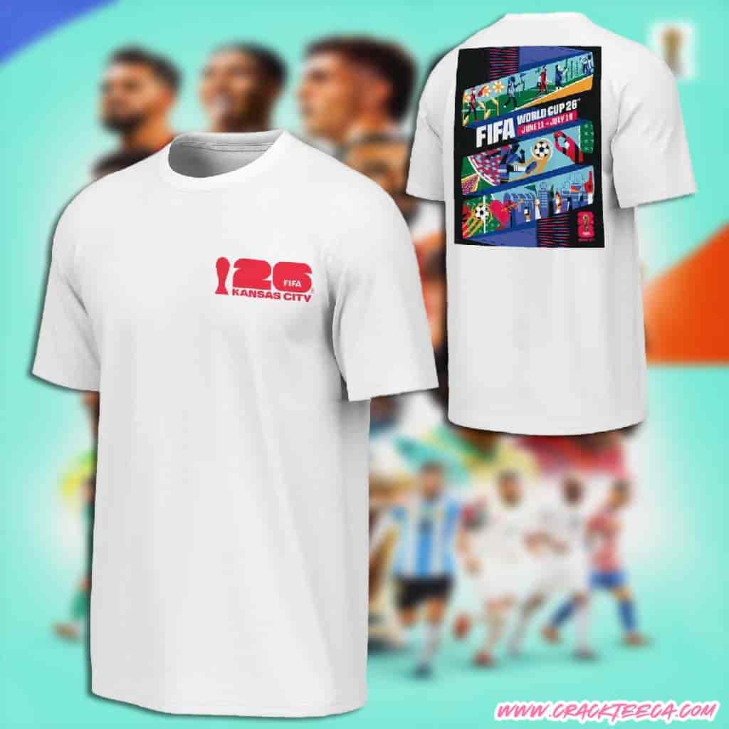 The FIFA 2026 World Cup Kansas City Poster White T-Shirt Unisex is a definitive piece of officially licensed apparel designed for football fans, memorabilia collectors, and proud residents of the Midwest eager to celebrate the region’s central role in the upcoming global tournament. This commemorative garment highlights the official “Host City Poster” artwork, a significant visual identifier for the event, which was unveiled as part of the broader “We Are 26” campaign. The specific design featured on this shirt is the “Woven Together” poster, created by local Kansas City artist Jadie Arnett. The artwork effectively bridges the state lines of Kansas and Missouri, using the universal symbol of a soccer scarf to depict a unified community. The graphic is rich with local iconography, detailing three distinct scenes: a journey beginning with Kansas sunflowers and aviation history, moving into the intense atmosphere of match play, and culminating in a victory celebration at Union Station featuring jazz instruments, BBQ culture, and the city’s famous fountains. These elements are printed vividly against the white cotton fabric, ensuring the colorful “Kansas City 26” logo—which integrates the FIFA World Cup trophy with local heritage symbols—stands out as the primary focal point.