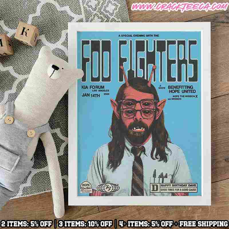 The Foo Fighters Los Angeles January 14 2026 – Dave Grohl’s 57th Birthday at the Kia Forum Home Decor Poster Canvas is designed as a premium, commemorative-style art piece celebrating two powerful pillars of modern rock culture: the enduring legacy of Foo Fighters and the cultural impact of frontman Dave Grohl. January 14 holds significant meaning for fans worldwide as it marks Grohl’s birthday, and by 2026 he will be turning 57, representing nearly four decades of influence in rock music, from his early days with Nirvana to leading one of the most respected live bands in the world. While an official concert tied specifically to his birthday at the Kia Forum in Inglewood (Greater Los Angeles) has not yet been formally announced at this time, this canvas is created in the spirit of a potential landmark night — a hypothetical, fan-imagined celebration in one of Southern California’s most iconic music venues. The Kia Forum, located just minutes from LAX and adjacent to SoFi Stadium, is historically renowned for hosting genre-defining concerts, Grammy Award recordings, and milestone shows by legendary artists, making it an authentic and highly relevant setting for a Foo Fighters tribute design. Visually, the poster concept typically features the instantly recognizable double-“F” Foo Fighters logo, bold event typography, a stylized image or silhouette of Dave Grohl behind the drum kit or on stage with a guitar, and warm, electric color tones inspired by Los Angeles nightlife — all arranged in a layout that mirrors an authentic tour-grade gig poster. Printed on premium canvas or heavyweight poster paper, the piece is intended for indoor display in music studios, living rooms, dorms, home theaters, or fan collections, offering both durability and gallery-style clarity. Beyond decoration, this artwork embodies a moment fans associate with resilience, community, and the healing power of live rock music following the band’s continued evolution in the post-Taylor Hawkins era. For longtime fans, it symbolizes loyalty; for new listeners, it represents discovery. Whether or not a performance actually takes place on January 14, 2026, this canvas stands as a tribute to Dave Grohl’s enduring influence, Foo Fighters’ global legacy, and Los Angeles’s role as a heartbeat of rock history — making it a meaningful, display-worthy addition to any music lover’s space.Product Related: Foo Fighters