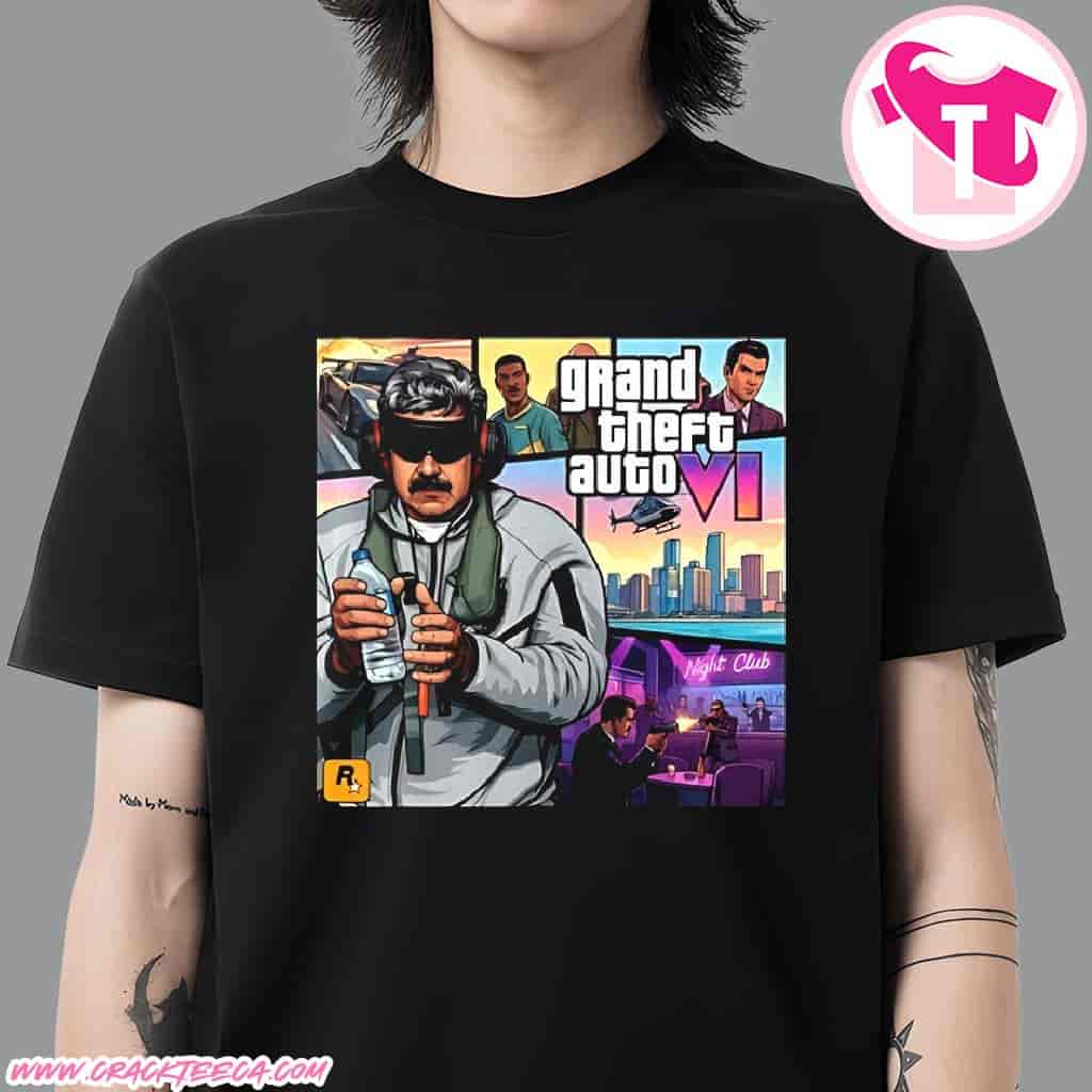 Contextually, this apparel bridges the gap between the massive cultural hype surrounding the return to the state of Leonida in *GTA 6* and the ongoing news cycle regarding U.S. indictments and international relations involving Venezuela. It functions as a piece of “meme wear,” capitalizing on the internet trend of editing real-world mugshots or news events into video game covers to create viral content. As a product of independent design rather than official merchandise from Rockstar Games or Take-Two Interactive, it falls squarely into the category of parody and transformative fan art. The shirt is generally constructed from durable, comfortable materials such as 100% pre-shrunk cotton or a soft heathered blend, featuring a unisex cut that accommodates a wide range of body types for casual daily wear or attendance at gaming conventions.