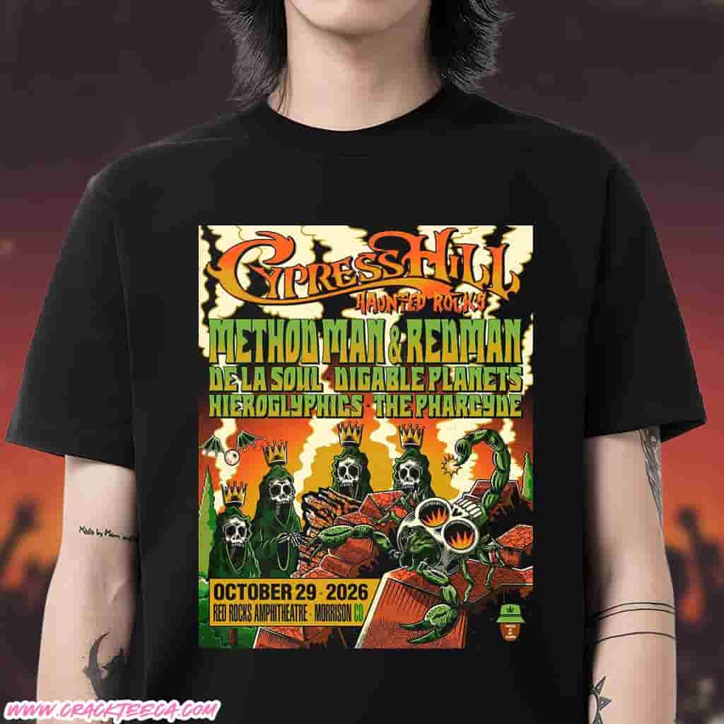 The Haunted Rocks With Cypress Hill 2026 At Red Rocks Amphitheatre In Morrison On October 29 T-Shirt is a specialized piece of concert merchandise produced for fans, hip-hop collectors, and attendees of this landmark seasonal event. This commemorative shirt celebrates the historic “Haunted Rocks” performance scheduled for Thursday, October 29, 2026, featuring West Coast hip-hop pioneers Cypress Hill alongside an expansive lineup of genre icons including Method Man and Redman, De La Soul, Digable Planets, Hieroglyphics, and The Pharcyde. The apparel serves as a wearable memento of this massive cultural gathering hosted at the world-renowned Red Rocks Amphitheatre, a geological marvel and open-air venue situated in Morrison, Colorado, near Denver. The design of the shirt typically incorporates the official Haunted Rocks branding, blending the legendary Cypress Hill skull and leaf iconography with a seasonal Halloween aesthetic fitting for the late October date. Visual elements often highlight the 2026 tour year and the specific venue location, rendered in high-quality graphics that reflect the group’s decades-long influence on the global music scene.