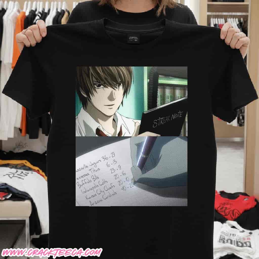 The “Houston Football Deathnote Anime Parody T-Shirt Streak Note Fan Gift” represents a distinct sub-genre of sports apparel that intersects the intense loyalty of American gridiron fandom with the visual language of Japanese pop culture. Designed for a demographic that bridges the gap between traditional “Bull Pen” supporters and the growing community of anime enthusiasts, this garment captures the zeitgeist of modern sports internet culture where memes and media converge. The shirt specifically references the “Death Note” manga and anime series, reinterpreting its central plot device—a supernatural notebook used to determine fates—into a “Streak Note” or “Win List.” In this context, the design typically functions as a tracker for the Houston team’s victories, often featuring a graphic list of AFC South rivals and other NFL opponents that have been “defeated” or crossed out, symbolizing the team’s dominance on the field.