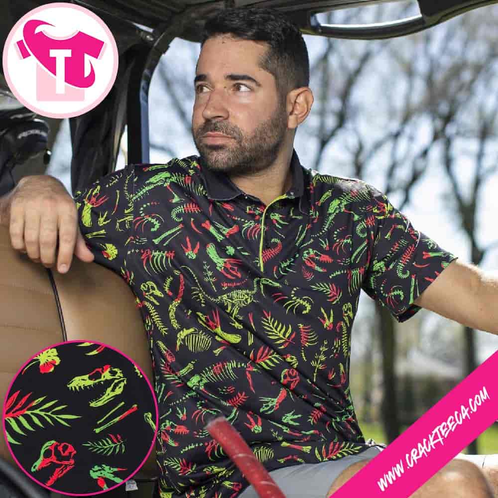 The “Jurassic Park Fossil Records All Day Golf Polo Shirt” acts as a sophisticated sartorial excavation, unearthing a design that appeals equally to amateur paleontologists and dedicated golfers. Produced under the Breakfast Balls label, the dedicated golf lifestyle subdivision of RSVLTS, this garment is tailored for the demographic that grew up fascinated by the science behind Michael Crichton’s prehistoric world and Steven Spielberg’s 1993 adaptation. The visual identity of the “Fossil Records” pattern is a curated display of osteology, featuring an intricate, all-over print of museum-quality dinosaur skeletons. The design typically showcases the recognizable cranial and skeletal structures of the franchise’s apex predators and herbivores—such as the Tyrannosaurus Rex, Triceratops, and Velociraptor—rendered in stark, fossilized white against a contrasting dark background. This aesthetic transforms the wearer into a walking exhibit, offering a more intellectual and subtle nod to the series compared to standard logo merchandise, effectively bridging the gap between scientific curiosity and fairway fashion.