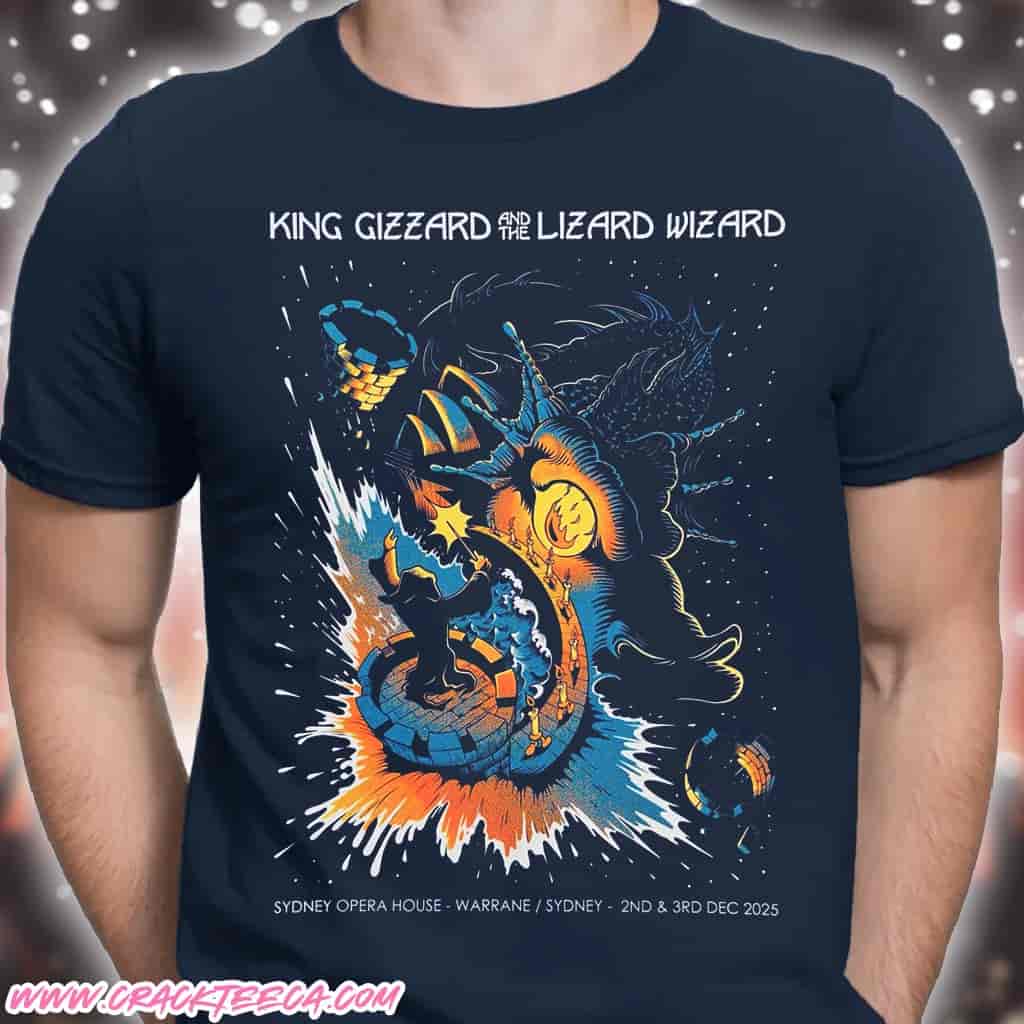 Commemorate a symphonic collision of psychedelia and classical grandeur with the Official King Gizzard And The Lizard Wizard Poster At Sydney Opera House In Sydney Australia On December 2 2025 T-Shirt, a wearable masterpiece that immortalizes the band’s historic “Phantom Island” orchestral premiere. This exclusive merchandise features the official show poster artwork created by long-time visual collaborator Jason Galea, whose design for this specific night is widely celebrated for its deep, ethereal blue color palette and distinct “Fantasia-esque” aesthetic—perfectly mirroring the magical atmosphere of the band’s collaboration with the Sydney Symphony Orchestra. The artwork likely depicts a surreal, sorcerous interpretation of the band’s “Gizzverse” lore, blending the architectural sails of the iconic Opera House with the mythical elements of their new album Phantom Island, capturing the energy of a night where conductor Chad Kelly led a 29-piece ensemble through orchestral arrangements of heavy hitters like “Iron Lung” and “Dragon,” alongside the live debut of the entire Phantom Island record.