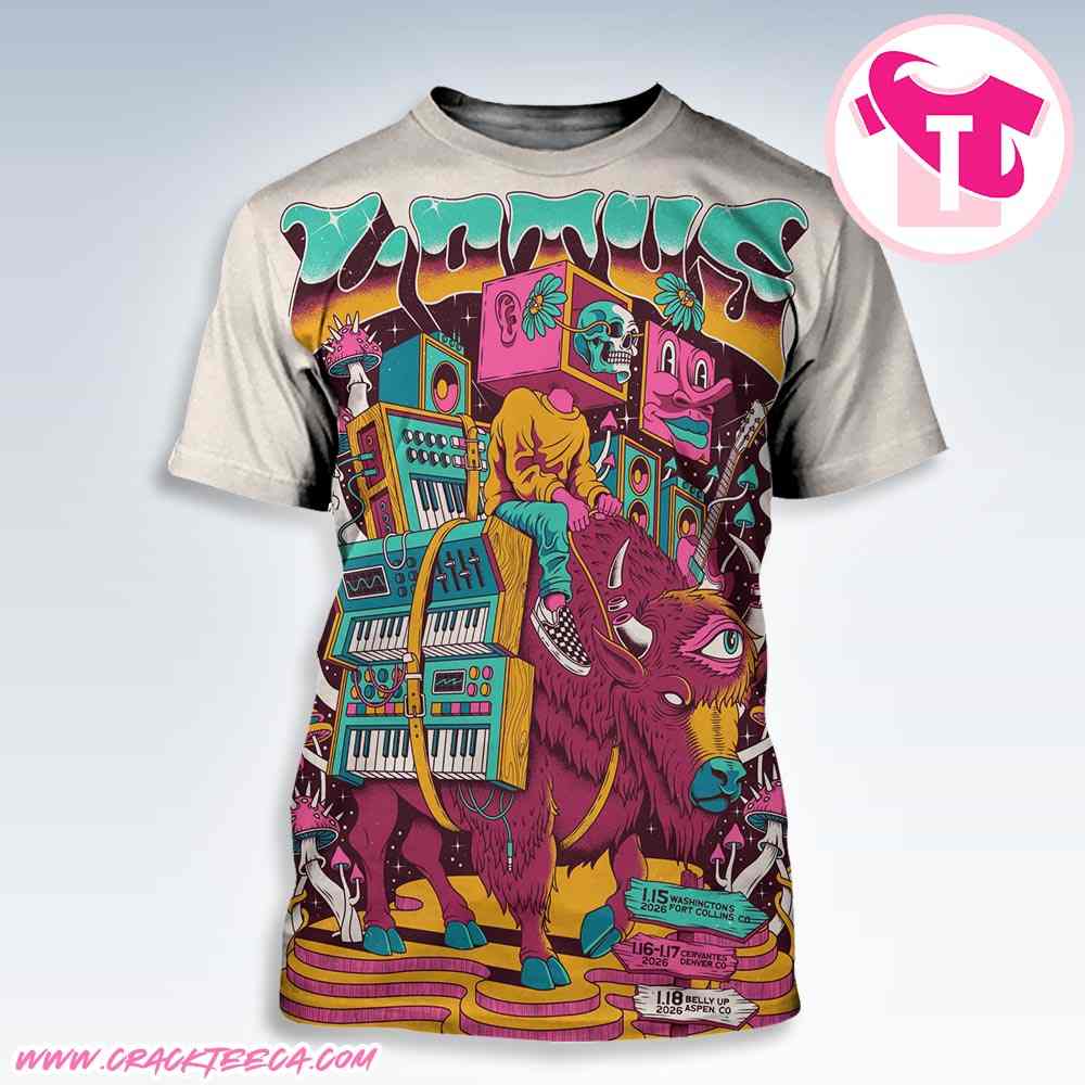 The Lotus Band Colorado Tour 2026 Fort Collins Denver and Aspen On January 15-16-17-18 All Over Print Shirt is a premium piece of commemorative apparel designed for dedicated fans of the pioneering jamtronic quintet. This official-style tour merchandise celebrates the high-energy Colorado residency that serves as the opening leg of the band’s “Rise of the Anglerfish” 2026 Winter Tour. Targeted at concert attendees, students, and long-time members of the jam band community, the shirt documents four consecutive nights of improvisational excellence across the state’s most prestigious musical hubs. The itinerary captured in the design begins on Thursday, January 15, at Washington’s in Fort Collins, followed by a momentous two-night stand on Friday, January 16, and Saturday, January 17, at the legendary Cervantes’ Masterpiece Ballroom in Denver. The regional trek concludes on Sunday, January 18, with an intimate performance at the world-renowned Belly Up Aspen, providing fans with a comprehensive visual archive of the band’s mid-winter Rocky Mountain run.