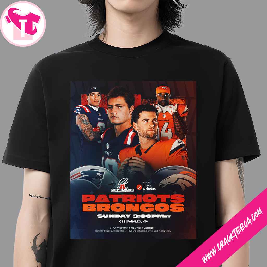 The New England Patriots Vs Denver Broncos AFC Championship On January 25 2026 T-Shirt is a premium commemorative garment designed for NFL enthusiasts, sports collectors, and those seeking a high-value gift for fans of these iconic AFC powerhouses. This officially licensed piece of apparel documents the historic conference finale of the 2025-2026 National Football League season, marking a pivotal moment as these two franchises compete for the Lamar Hunt Trophy and a trip to Super Bowl LX. The shirt’s design features the verified branding of both the New England Patriots and the Denver Broncos, highlighting the fierce head-to-head rivalry that has defined several eras of postseason football. Central to the visual composition are the official team logos and the January 25, 2026, game date, presented in a vibrant palette of nautical blue, sunset orange, and college navy. Each item is constructed from 100% high-quality ring-spun cotton or a soft-touch cotton-poly blend, ensuring maximum breathability and long-lasting comfort for spectators at Empower Field at Mile High in Denver, Colorado. The shirt incorporates professional-grade screen-printed graphics that include the AFC Championship title and references to the road to Levi’s Stadium in Santa Clara, where the 60th Super Bowl is held. This product serves as a functional historical archive of the 2025-2026 season, reflecting the elite performances of teams that both secured impressive 14-3 regular-season records. Whether worn at a festive gameday gathering or preserved as a central piece in a professional sports memorabilia collection, the t-shirt provides immense value for gifting during the high-stakes playoffs. The structural integrity of the garment, often featuring double-needle stitching and a durable ribbed collar, ensures it remains a staple in any fan’s wardrobe through future seasons. By documenting the specific geographic context of the Rocky Mountain region and the prestige of the conference title game, this apparel acts as more than just clothing; it is a tangible tribute to the journey of star athletes and the legacy of the league’s most successful organizations. This AFC Championship 2026 t-shirt is an essential acquisition for those looking to commemorate the high-altitude battle in Denver and the intense competition of the NFL playoffs. As fans gear up for the final showdown before the February 8 championship in California, this brand-safe and informative piece of merchandise offers an authentic way to celebrate the resilience and skill required to reach the pinnacle of professional football.
