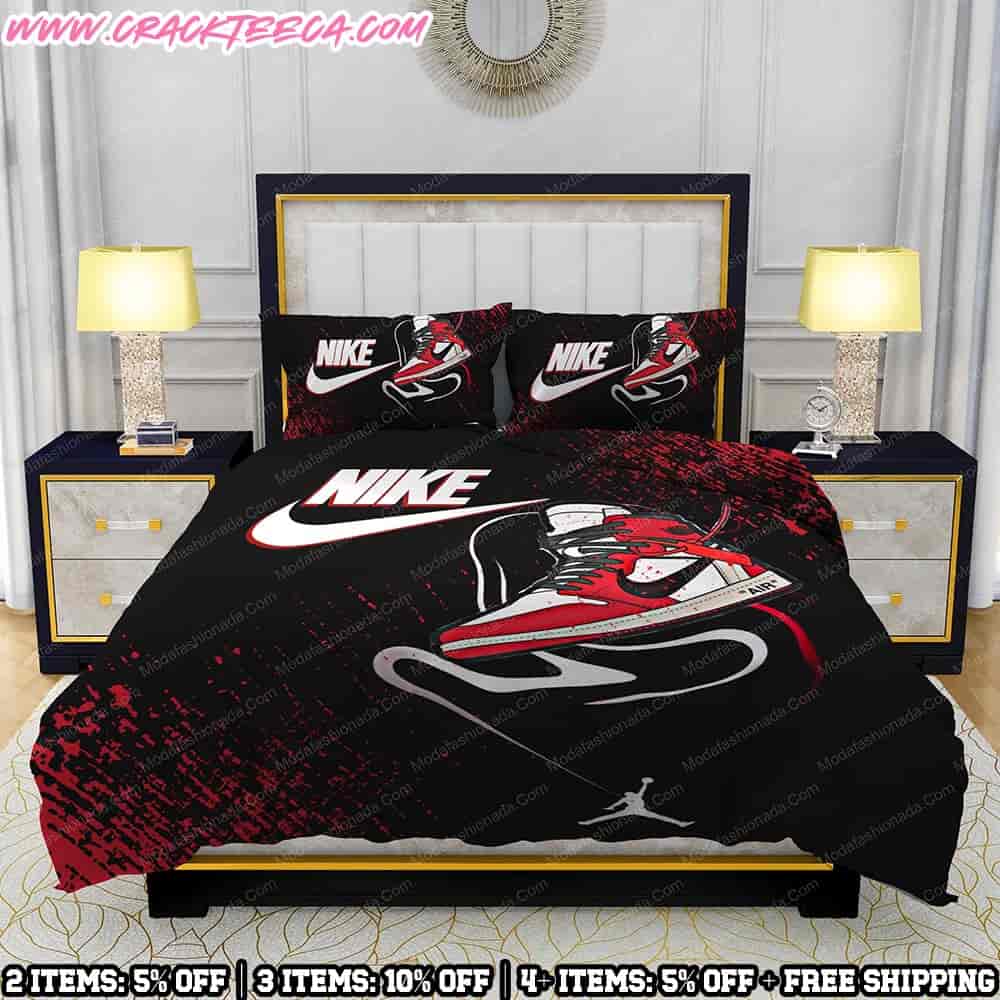 This Nike Bedding Set Air Jordan 1 Chicago Sneaker Art On Black Grunge Background functions as a high-impact focal point that instantly defines the aesthetic trajectory of a contemporary bedroom, merging the rebellious spirit of street culture with the functional comfort of premium home textiles. Designed for the dedicated sneaker enthusiast or the aficionado of urban industrial interior design, this bedding ensemble showcases a high-definition artistic rendering of the legendary Air Jordan 1 in its iconic “Chicago” colorway—a palette of Varsity Red, White, and Black that has transcended basketball courts to become a symbol of global fashion history. The sneaker graphic is juxtaposed against a meticulously detailed black grunge background, featuring distressed textures, scratch marks, and subtle tonal variations that add depth and a raw, edgier atmosphere compared to standard solid-color linens. Crafted from high-grade brushed microfiber polyester, the fabric undergoes a specialized mechanical brushing process to raise the surface fibers, resulting in a “peach-skin” finish that offers exceptional softness against the skin while maintaining a lightweight profile. This material choice is scientifically favored in the home textile industry for its inherent hypoallergenic properties, creating a barrier against dust mites and allergens, which is essential for maintaining a healthy sleeping environment. The duvet cover and pillowcases utilize advanced dispersion printing technology, a method where the ink penetrates deep into the fabric fibers rather than sitting on top, ensuring that the deep blacks of the grunge background remain rich and the vibrant reds of the sneaker art resist fading, even after multiple machine wash cycles. In terms of thermal regulation, the high-density weave of the microfiber provides breathability for year-round comfort, wicking away moisture during warmer months while trapping body heat effectively during cooler seasons. This bedding set does more than provide warmth; it anchors the living space, transforming a generic dormitory or master suite into a curated personal sanctuary that reflects the “hypebeast” lifestyle and an appreciation for sneaker culture. The design aligns perfectly with modern masculine or unisex decor trends that favor bold graphics and dark, moody tones, making it an ideal choice for a bedroom makeover that demands character and visual weight. Practically, the fabric is engineered to be wrinkle-resistant and quick-drying, offering a low-maintenance solution for busy lifestyles without compromising on the luxurious, gallery-worthy appearance that celebrates the intersection of athletic heritage and modern art.