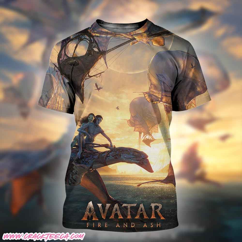 Designed for the dedicated global community of James Cameron’s cinematic universe, the Official Poster Avatar Fire And Ash On December 19 2025 All Over Print Shirt stands as a wearable testament to the franchise’s expansion into new and volatile territories. This apparel piece is tailored for science fiction collectors and moviegoers preparing for the theatrical launch of *Avatar: Fire and Ash*, scheduled for December 19, 2025, by 20th Century Studios. Distinct from standard screen-printed merchandise which restricts imagery to a central block, this garment utilizes a dye-sublimation all-over print technique, ensuring the graphic narrative wraps seamlessly around the torso, back, and sleeves. The visual design rigorously reflects the film’s thematic departure from the aquatic serenity of *The Way of Water*, embracing the aggressive and darker aesthetic associated with the “Ash People,” a new and antagonistic clan of Na’vi introduced in this third installment. Consequently, the color palette shifts towards intense shades of charcoal, volcanic red, and ember orange, contrasting sharply with the bioluminescent blues of Pandora’s forests and oceans, while prominently displaying the official film title and the significant 2025 release marker.