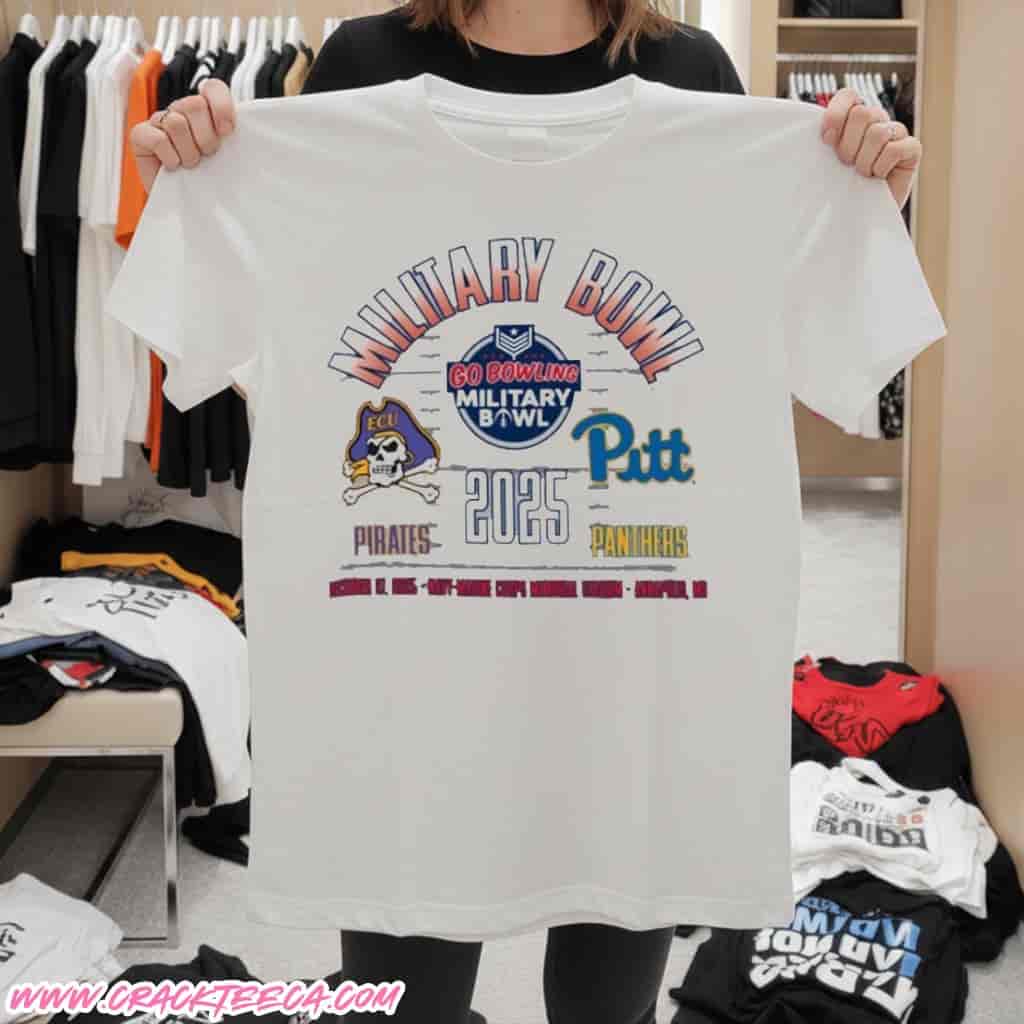 About Pittsburgh Panthers Vs East Carolina Pirates Go Bowling Military Bowl 2025 T-Shirt By Crackteeca