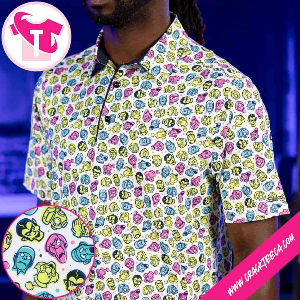 The “Scooby-Doo Phantom Faces All Day Golf Polo Shirt” serves as a premier example of the synthesis between high-performance athletic engineering and the rich legacy of Saturday morning animation, specifically tailored for the golfer who enjoys a touch of mystery on the links. Manufactured under the Breakfast Balls label, the dedicated golf lifestyle division of the apparel brand RSVLTS, this garment is designed for a diverse demographic that includes animation historians, dedicated collectors of Hanna-Barbera memorabilia, and recreational players seeking to break the mold of traditional, monochromatic fairway fashion. The design ethos of the “Phantom Faces” pattern is a curated rogues’ gallery, featuring a dynamic, all-over print that isolates the menacing yet beloved visages of the franchise’s most iconic antagonists. The visual narrative typically showcases the floating masks and heads of legendary villains such as the Spooky Space Kook, the Witch Doctor, the Creeper, and the glowing green Phantom Shadow, all set against a dark, contrasting background that allows the vibrant neon accents of the characters to pop, creating a “haunted” aesthetic suitable for both October play and year-round fandom.