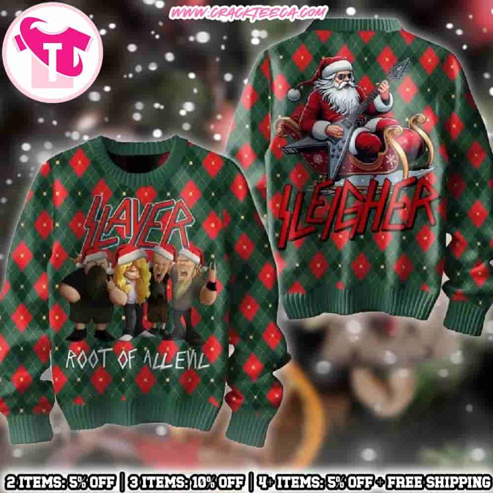 The Slayer “Root of All Evil” Ugly Christmas Sweater is a striking and edgy holiday apparel piece that perfectly combines the band’s legendary thrash metal identity with festive, family-friendly humor, making it an ideal gift for fans, friends, and family who love music with attitude. Slayer, formed in 1981 in Huntington Park, California, is recognized as one of the most influential and enduring bands in metal history, with iconic albums such as Reign in Blood, South of Heaven, and Seasons in the Abyss shaping the thrash metal genre and inspiring generations of fans worldwide. This ugly sweater draws inspiration from the band’s dark, intense aesthetic while adding seasonal elements, including snowflakes, holiday patterns, and Christmas-themed motifs, creating a bold contrast between Slayer’s aggressive imagery and festive design. The phrase “Root of All Evil” nods to the band’s exploration of heavy themes and provocative storytelling, while the playful holiday interpretation makes it a fun, memorable, and collectible piece for the season.