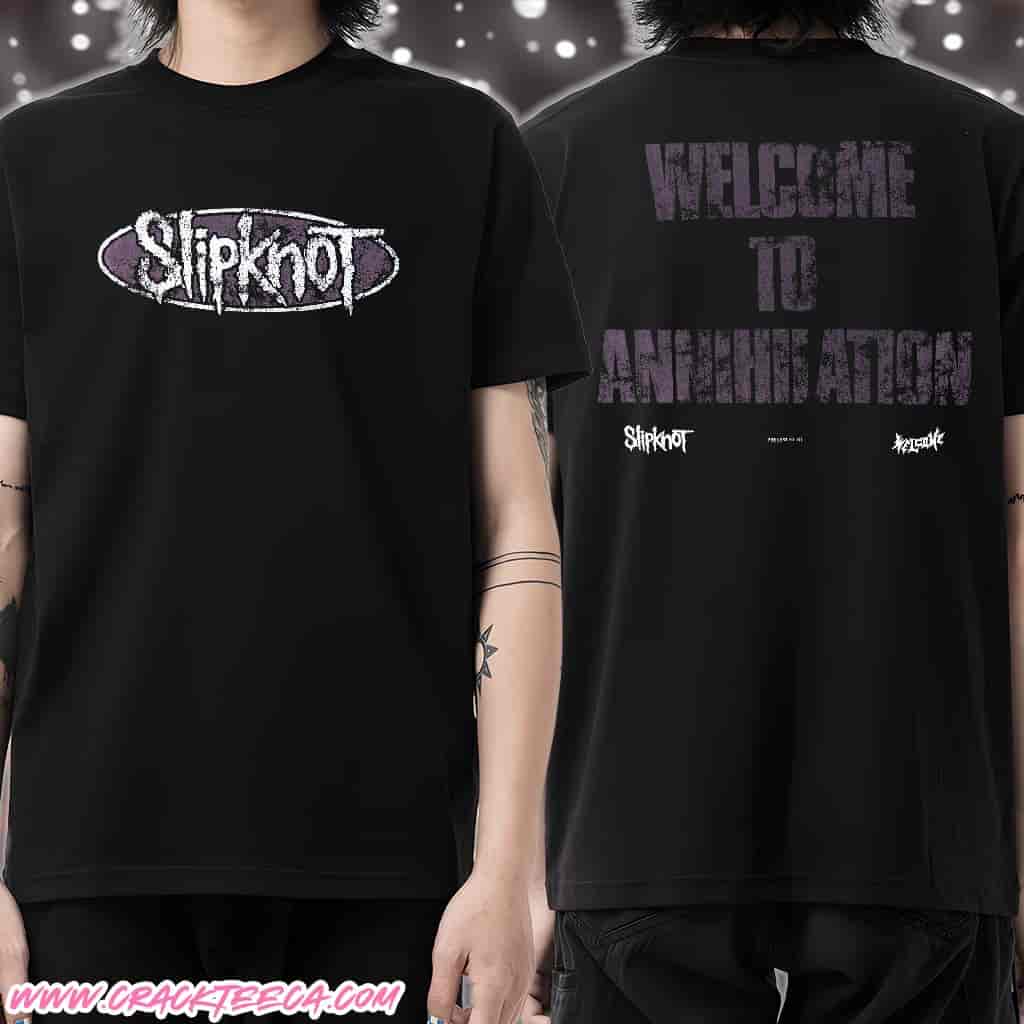 The Slipknot X Welcome Skateboards Merchandise Annihilation Short Sleeve T-Shirt stands as a definitive piece of streetwear that bridges the gap between aggressive heavy metal iconography and the subculture-driven aesthetics of modern skateboarding. Released as part of a highly anticipated, officially licensed capsule collection, this garment targets both the dedicated “maggots” of the Slipknot fanbase and the loyal following of Welcome Skateboards, a brand renowned for its occult-inspired, hand-drawn artistic direction. The shirt serves as a tangible intersection of two distinct but compatible worlds, celebrating the raw, chaotic energy that defined Slipknot’s emergence from Des Moines, Iowa, in the late 1990s, while filtering it through the “others welcome” philosophy of the California-based skate company. The design aesthetic of this collaboration is celebrated for its grit, typically utilizing a high-quality, heavyweight cotton chassis that offers a boxy, relaxed fit suitable for skating, distinct from the thinner blanks often used for standard concert merchandising. The “Annihilation” graphic within this collection embodies the dark, surreal visual language shared by both entities, often merging Slipknot’s classic tribal ‘S’ logo, the nonagram, or the menacing masks of the 1999 era with Welcome’s signature gothic typography and talismanic illustrations. This specific visual synthesis creates a garment that feels less like a simple logo placement and more like a curated art piece, reflecting the “outsider” status championed by both the band and the board brand. Contextually, this item arrives during a period of resurgence for nu-metal aesthetics in fashion, making it a relevant piece for contemporary style enthusiasts as well as long-time listeners. For collectors, the value lies in the limited nature of Welcome’s seasonal drops, which typically follow a “once gone, forever gone” model, transforming the t-shirt into a sought-after archival item rather than mere clothing. Whether worn to a heavy metal festival, a local skate park, or kept as a pristine collector’s item, the shirt functions as a badge of identity for those who appreciate the uncompromising ethos of the 9-piece band. By securing the official rights to use Slipknot’s protected intellectual property, Welcome Skateboards ensures the authenticity of the product, appealing to consumers who prioritize legitimate artist support over bootleg alternatives. The collaboration highlights the enduring relevance of the band’s visual identity, proving that their imagery remains a powerful force in counter-culture fashion decades after their debut. Keywords seamlessly integrated include: Slipknot Welcome Skateboards collaboration, limited edition nu-metal apparel, heavy metal skate gear, licensed music merchandise, alternative streetwear fashion.