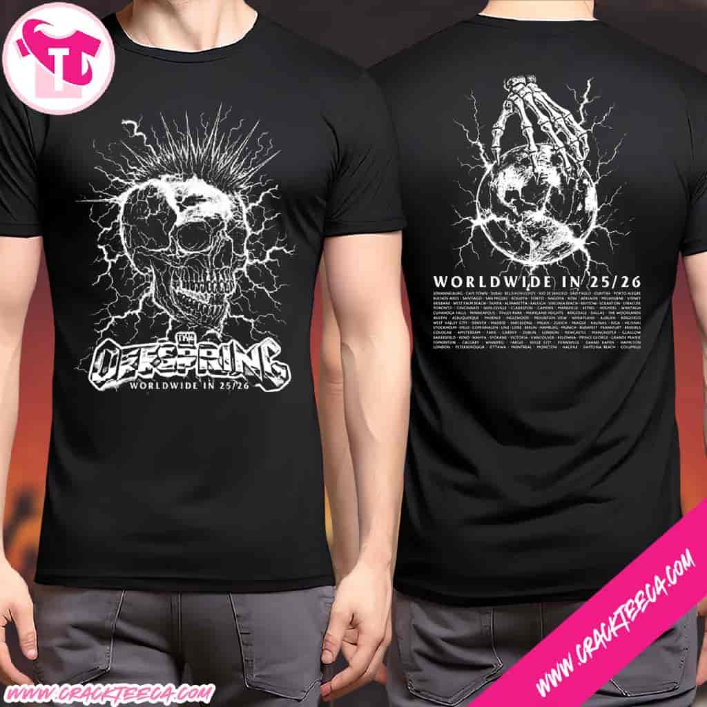 The The Offspring Mohawk Skull “Supercharged” Worldwide 2026 Tour Cities List Merchandise T-Shirt serves as the definitive wearable archive for the extended 2026 leg of the punk rock legends’ global trek supporting their eleventh studio album, Supercharged. Released to coincide with the band’s continued domination of international arenas and festivals throughout 2026, this apparel item is designed specifically for multi-generational fans—from those who discovered them during the Smash era to new listeners of their modern high-energy anthems. As a core piece of the official touring collection, available at merchandise booths at major venues and through the band’s authorized webstore, this shirt captures the electric aesthetic that defines the Supercharged album cycle, which originally kicked off following the record’s release in late 2024.