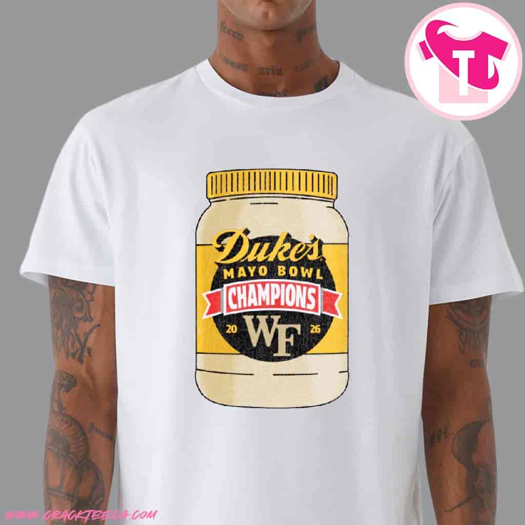 The Wake Forest Demon Deacons 2026 Duke’s Mayo Bowl Champions Locker Room T-Shirt stands as the premier collectible for the “Deacon Nation,” offering fans the exclusive opportunity to own the exact same apparel worn by the players and coaching staff during the post-game celebration in Charlotte. This officially licensed NCAA garment marks the culmination of a successful 2025-2026 campaign, permanently commemorating Wake Forest’s decisive 43-29 victory over the Mississippi State Bulldogs on January 2, 2026. As a “Locker Room” edition, the design is engineered to capture the raw emotion and immediacy of the triumph at Bank of America Stadium, featuring bold, screen-printed “Champions” typography that dominates the chest, flanked by the iconic Wake Forest “WF” logo and the distinctive Duke’s Mayo Bowl insignia. The visual aesthetic strictly adheres to the university’s Old Gold and Black color palette, ensuring that the merchandise authenticates the wearer’s connection to the program’s rich ACC heritage.