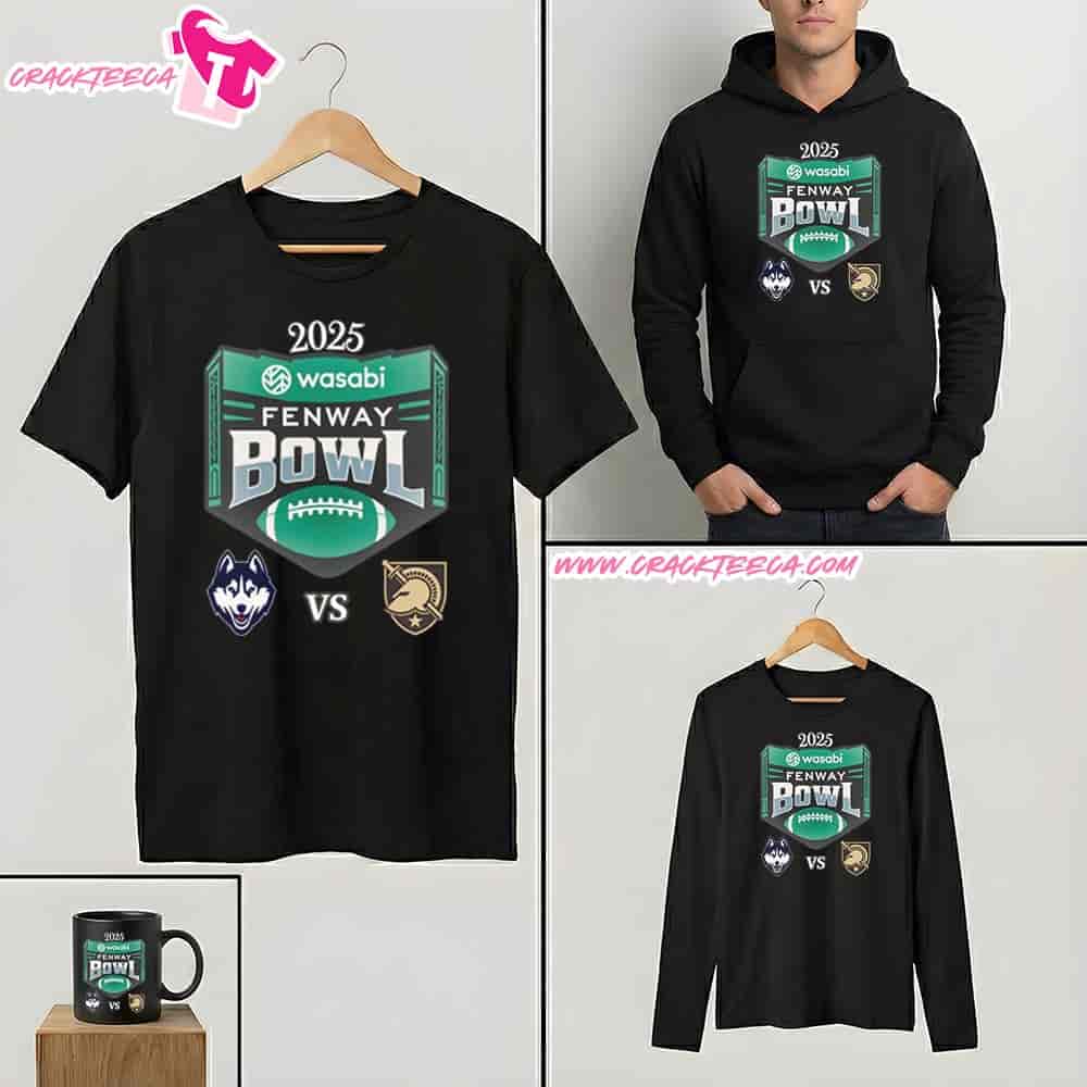 The Wasabi Fenway Bowl 2025 Uconn Huskies Vs Army Black Knights December 27 T-Shirt serves as the primary commemorative garment for this distinct postseason matchup, capturing the excitement of collegiate football returning to one of sport’s most hallowed grounds. Designed to appeal to the passionate fan bases of both the University of Connecticut and the United States Military Academy, this apparel documents the specific details of the December 27, 2025, contest held in Boston, Massachusetts. The design typically employs a classic “dueling” graphic composition, prominently featuring the UConn Huskies’ fierce canine logo alongside the Army Black Knights’ sword and shield or Athena helmet insignia. This visual arrangement highlights the competitive nature of the game while contrasting the Huskies’ Navy Blue and White palette with Army’s stoic Black and Gold. Central to the shirt’s aesthetic is the official Wasabi Fenway Bowl logo, which anchors the merchandise in its specific corporate sponsorship era, ensuring it is recognized as authentic event memorabilia rather than generic team wear.