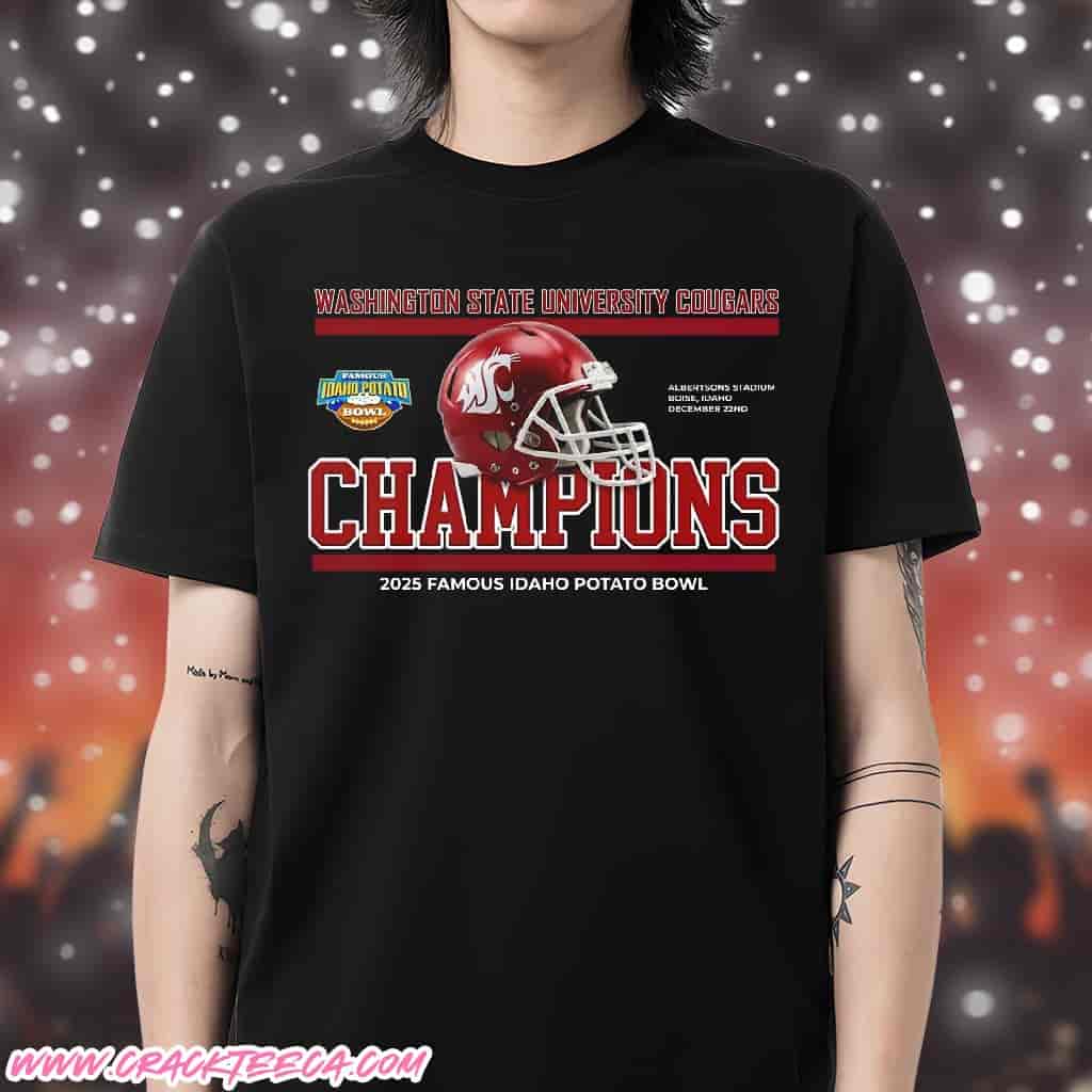 Commemorate the Washington State Cougars’ dominant performance in the 2025 postseason with the Famous Idaho Potato Bowl Champions December 22nd Helmet Unisex T-Shirt, a definitive piece of memorabilia for dedicated supporters and alumni. This apparel honors the Cougars’ impressive 34-21 victory over the Utah State Aggies on December 22, 2025, a game that highlighted the program’s resilience under interim head coach Jesse Bobbit. The shirt’s design centers on a high-quality graphic of the iconic crimson Washington State football helmet, positioned prominently above the bold “Champions” lettering that signifies the team’s triumph in the 29th edition of this historic bowl game. Stamped with the specific date and the venue details of Albertsons Stadium in Boise, Idaho, the garment serves as a wearable timeline of the event, connecting fans directly to the action that unfolded on the renowned blue turf. The match was a showcase of offensive firepower, with the Cougars amassing a staggering 628 yards of total offense, led by the precision of quarterback Zevi Eckhaus and the playmaking ability of MVP Josh Meredith. This unisex t-shirt captures that energy, offering a comfortable and versatile fit suitable for game days at Martin Stadium or casual wear throughout the Pacific Northwest. By featuring the official Famous Idaho Potato Bowl logo alongside the university’s branding, the item reinforces the connection between the “Cougs” and the Gem State’s premier sporting event. The victory marked a significant achievement for the team as they navigated a transitional period, making this merchandise highly collectible for those wishing to preserve the memory of a season that concluded with a trophy celebration. Whether purchased as a gift for a current student or added to a personal collection of WSU gear, this shirt stands as a testament to the 2025 squad’s success against their Mountain West opponent. As an officially licensed product, it ensures authenticity in its representation of the university’s trademarks and colors, providing fans with a genuine connection to the program’s history. The precise detailing of the helmet graphic and the commemorative text ensures that the excitement of the December 22nd win in Boise remains a vivid part of the fan experience for years to come.