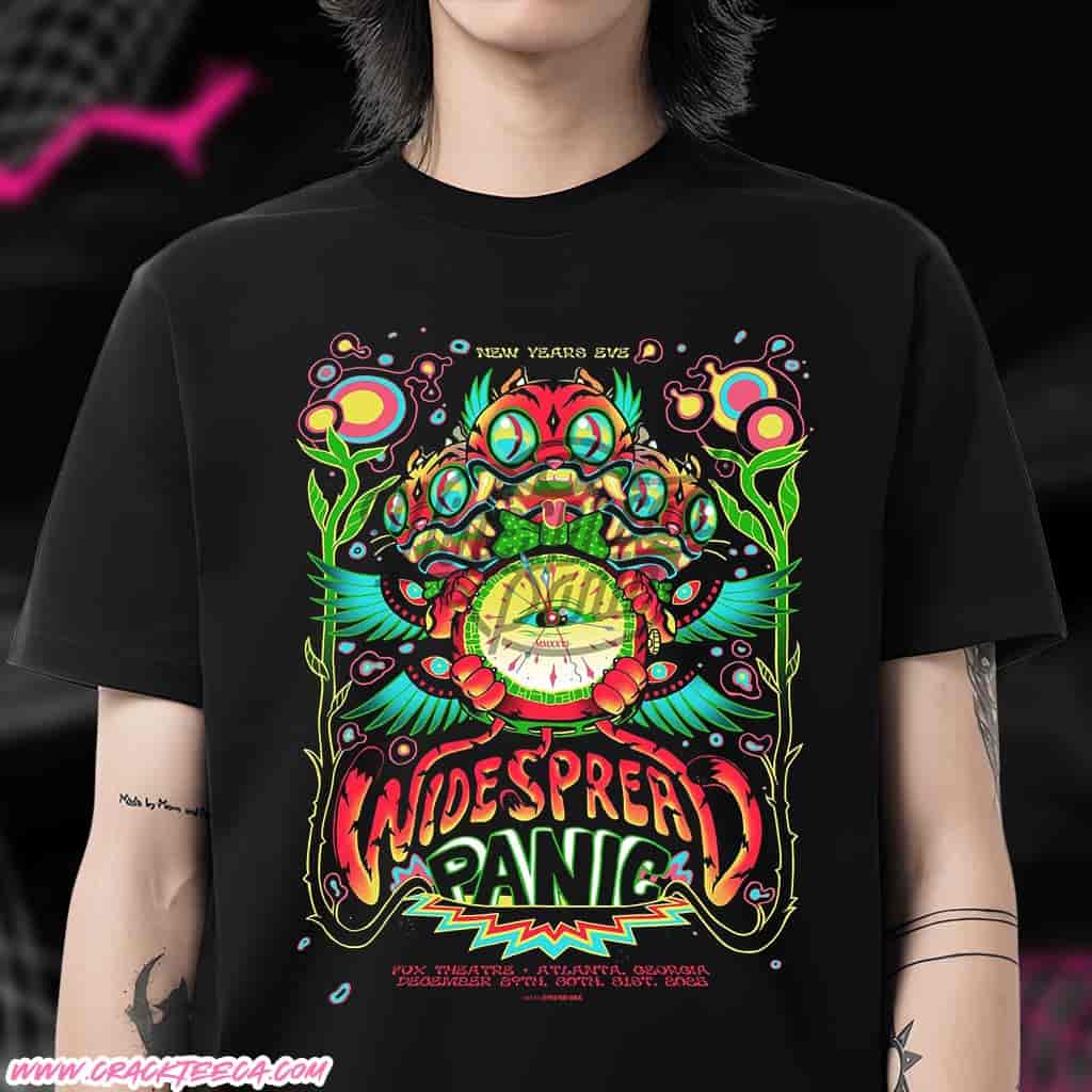 The Widespread Panic Atlanta New Years 2025 Official Poster T-Shirt serves as a distinctive fusion of apparel and visual art, designed to commemorate the band’s historic three-night residency at the Fabulous Fox Theatre. Tailored for the dedicated “Spreadhead” community, casual listeners, and collectors of rock memorabilia, this garment allows fans to wear the specific artistic imagery commissioned for the performances held on December 29, 30, and 31, 2025. Unlike standard tour merchandise, this shirt features the high-fidelity screen print of the official event poster, a format highly prized in the jam band scene where gig posters are treated as fine art. The design typically showcases the intricate, often psychedelic or surrealist aesthetics associated with Widespread Panic’s visual identity, frequently incorporating subtle nods to the Fox Theatre’s iconic Moorish and Egyptian architectural details, such as the onion domes or the starry sky ceiling. Constructed from premium, pre-shrunk cotton or a soft, durable cotton-blend fabric, the shirt is engineered for comfort, ensuring it remains wearable through repeated washes while retaining the vibrancy of the elaborate artwork.